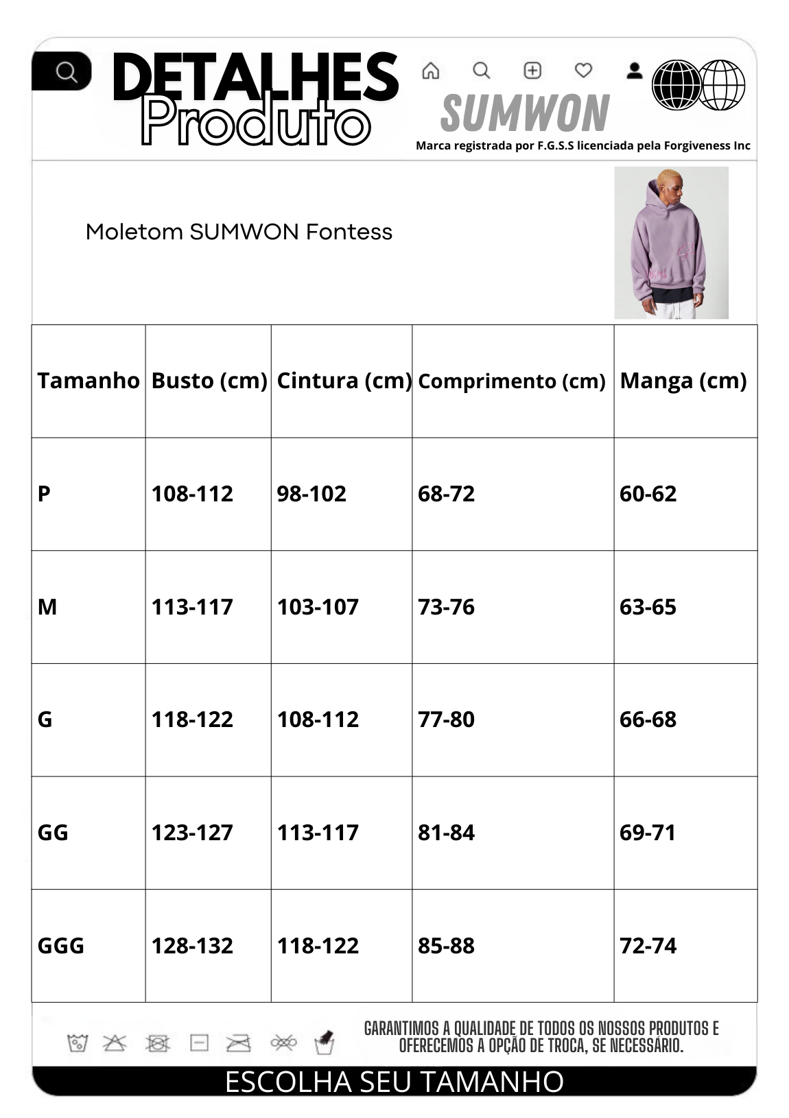 | Tamanho | Busto (cm) | Cintura (cm) | Comprimento (cm) | Manga (cm) |